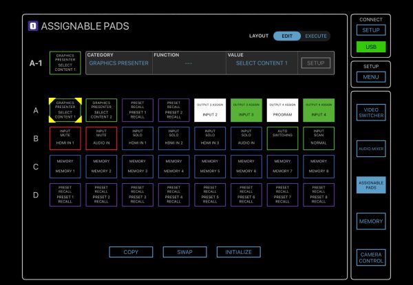 Ohjauspaneelissa on kahdeksan vapaasti ohjelmoitavaa painiketta neljässä pankissa, eli yhteensä 32 pikaohjauspaikkaa esimerkiksi signaalireititystä, äänenmykistyksiä ja järjestelmäasetuksia varten.
